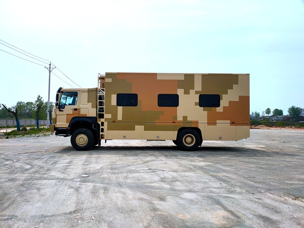 重汽豪沃底盤、箱體(鋼骨架、內、外蒙皮)宿營設施、上下床鋪、空氣調節(jié)系統、影視系統、電氣系統、安全系統整車配備衛(wèi)生間、廚房柴油發(fā)電機、蓄電池、凈水箱、污水箱,空調外加輔助裝備等。